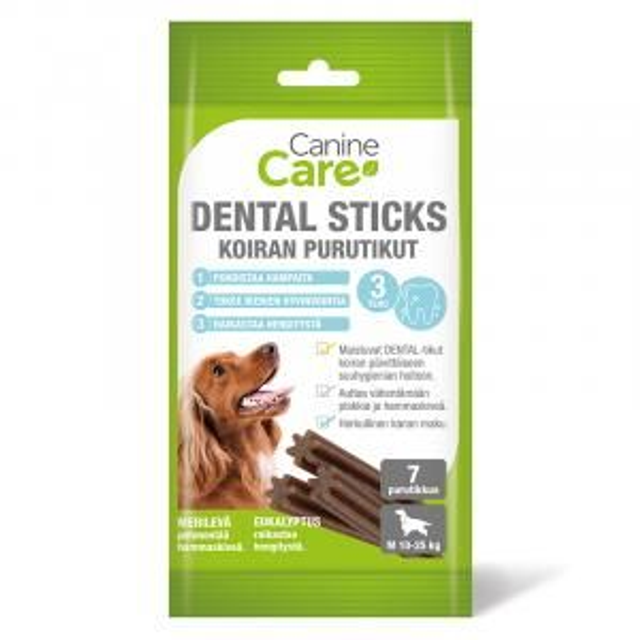 Maistuvat, merilevää ja raikastavaa eukalyptusta sisältävät DENTAL-purutikut koiran päivittäiseen suuhygienian hoitoon. Päivittäin käytettynä purutikut auttavat puhdistamaan koiran hampaita ja tukemaan ikenien hyvinvointia. Tikut ovat koostumukseltaan vähärasvaisia eivätkä sisällä lisättyä sokeria.